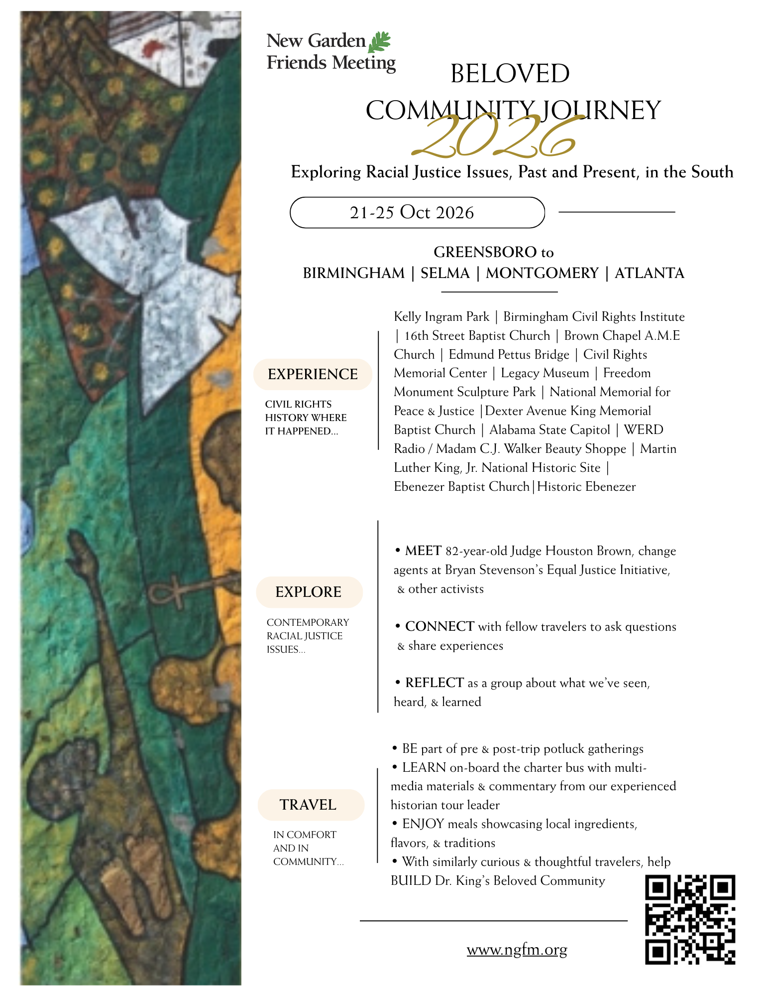 Experience civil rights history in Birmingham, Selma, Montgomery, and Atlanta; explore contemporary issues of race in our country; and meet change-agents working to make a difference.